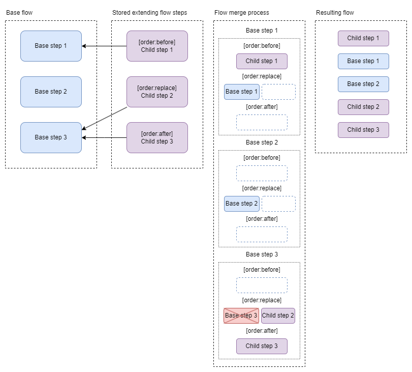 - For every base step it finds child steps in extending flow (steps whose base step is current base step)